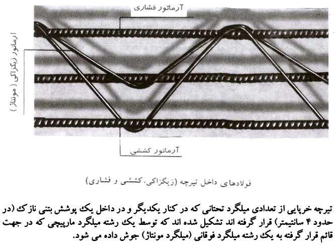 تيرچه پيش ساخته خرپايی مطابق شکل زیر برای تحمل مراحل سه گانه بارگذاری ذكر شده، از اجزای زير تشكيل شده است: