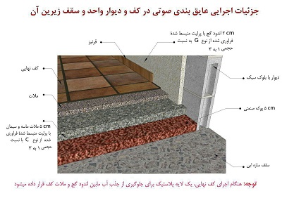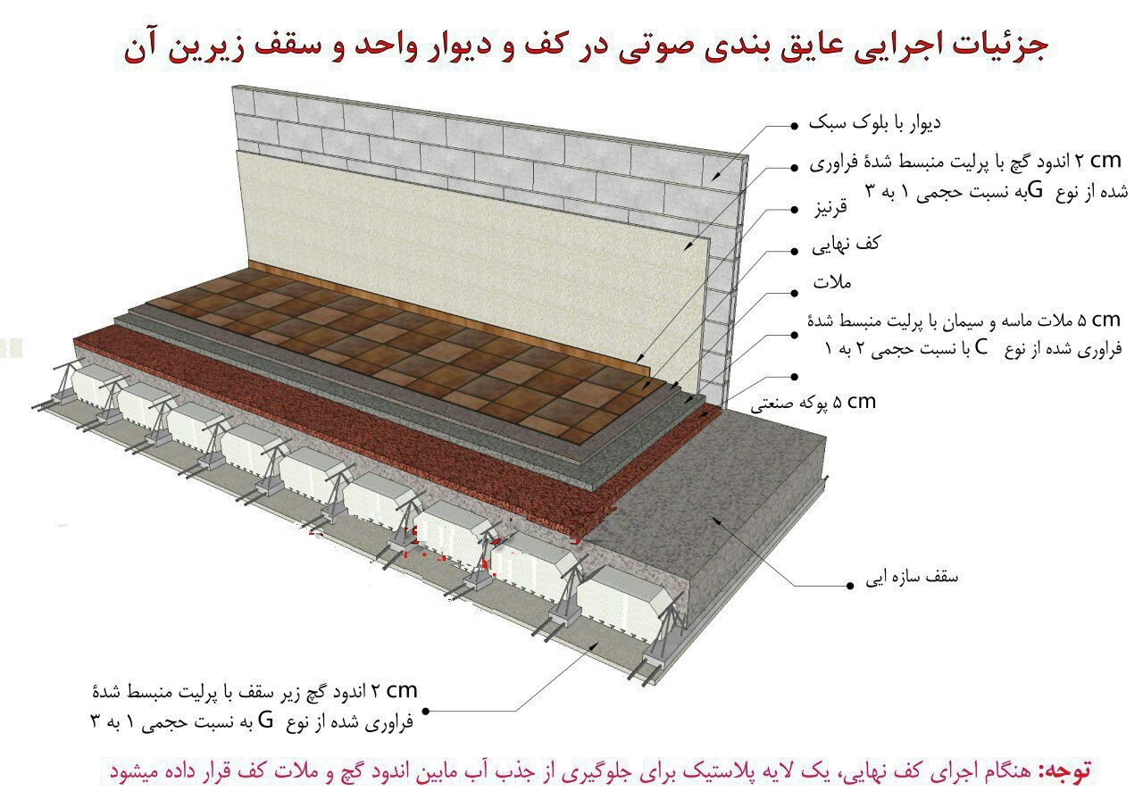 جزئیات اجرایی عایق بندی صوتی در کف و دیوار واحد و سقف زیرین آن
