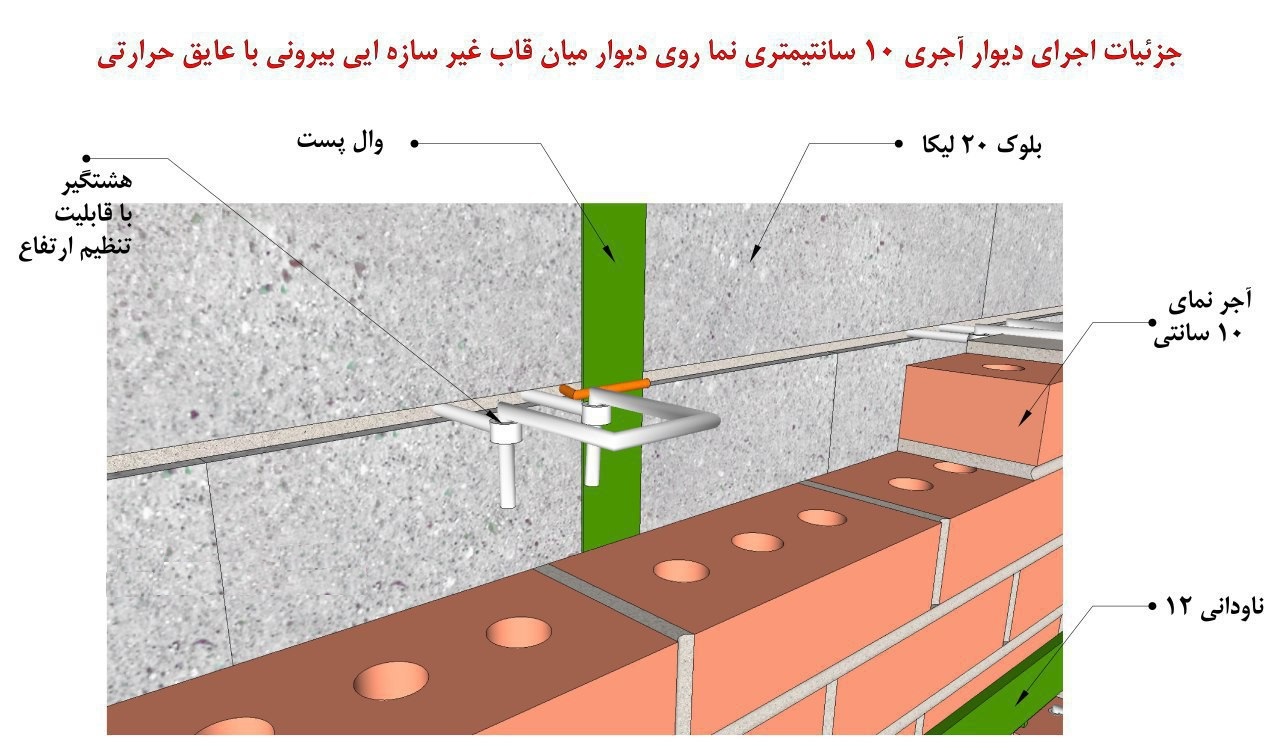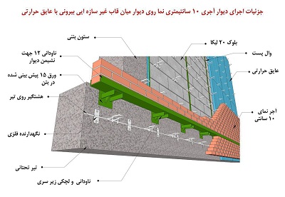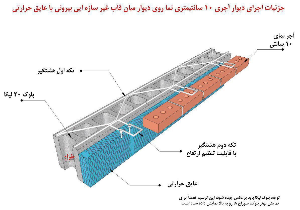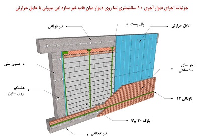 جزئیات اجرای دیوار آجری 10 سانتی نما روی دیوار میان قاب با عایق حرارتی