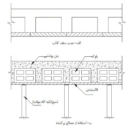 6- قالب بندی زير سقف، تنها به شمع بندی و نصب چهارتراش در فواصل معين، جهت تأمين تكیهگاه های موقت تيرچه ها،محدود می شود.