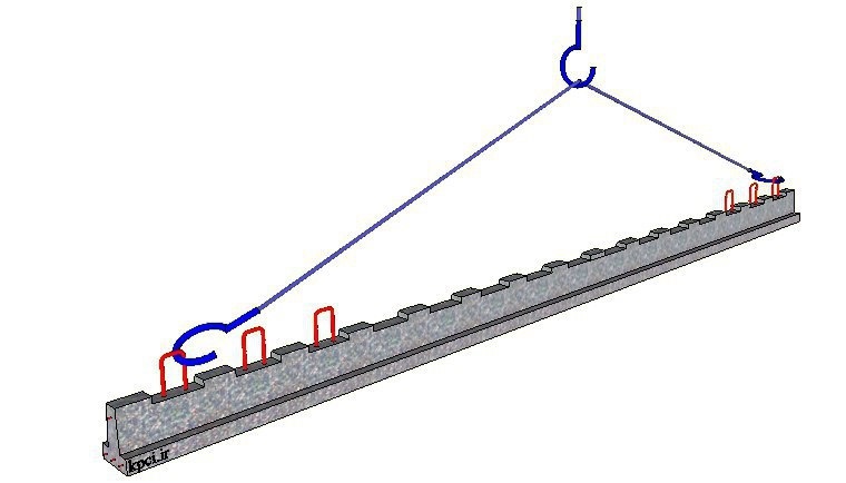 3- درهنگام حمل تيرچه توسط بالابر يا جرثقيل، بايد توجه نمود كه هر دو سر تيرچه به قلاب متصل گردد، چراکه اتصال قلاب به وسط تيرچه باعث ايجاد آسيب در آن میگردد. به منظور حمل با جرثقيل يا بالابر میتوان يك طناب رابه دو سر تيرچه بست و سپس قلاب حمل را به ميانه اين طناب متصل نمود.