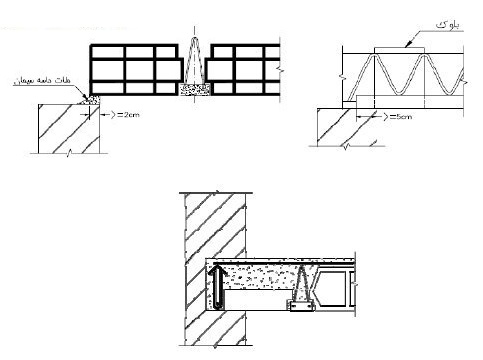 بعد از اجرای شمع بندی زير تيرچه ها و قالب بندی كلافها و بازشوها، نصب بلو كها آغاز ميشود. هنگام نصب بايد چيدمان بلوك ها به گونه ای باشد كه بلوك های انتهايی در روی تكيه گاه ها قرار نگيرند و فاصله آنها از قسمت های انتهايی و كناری براساس جزئيات نشان داده شده در شكل زیر باشد. از به كاربردن بلوك های شكسته و نامنظم در سقف بايد خودداری شود.